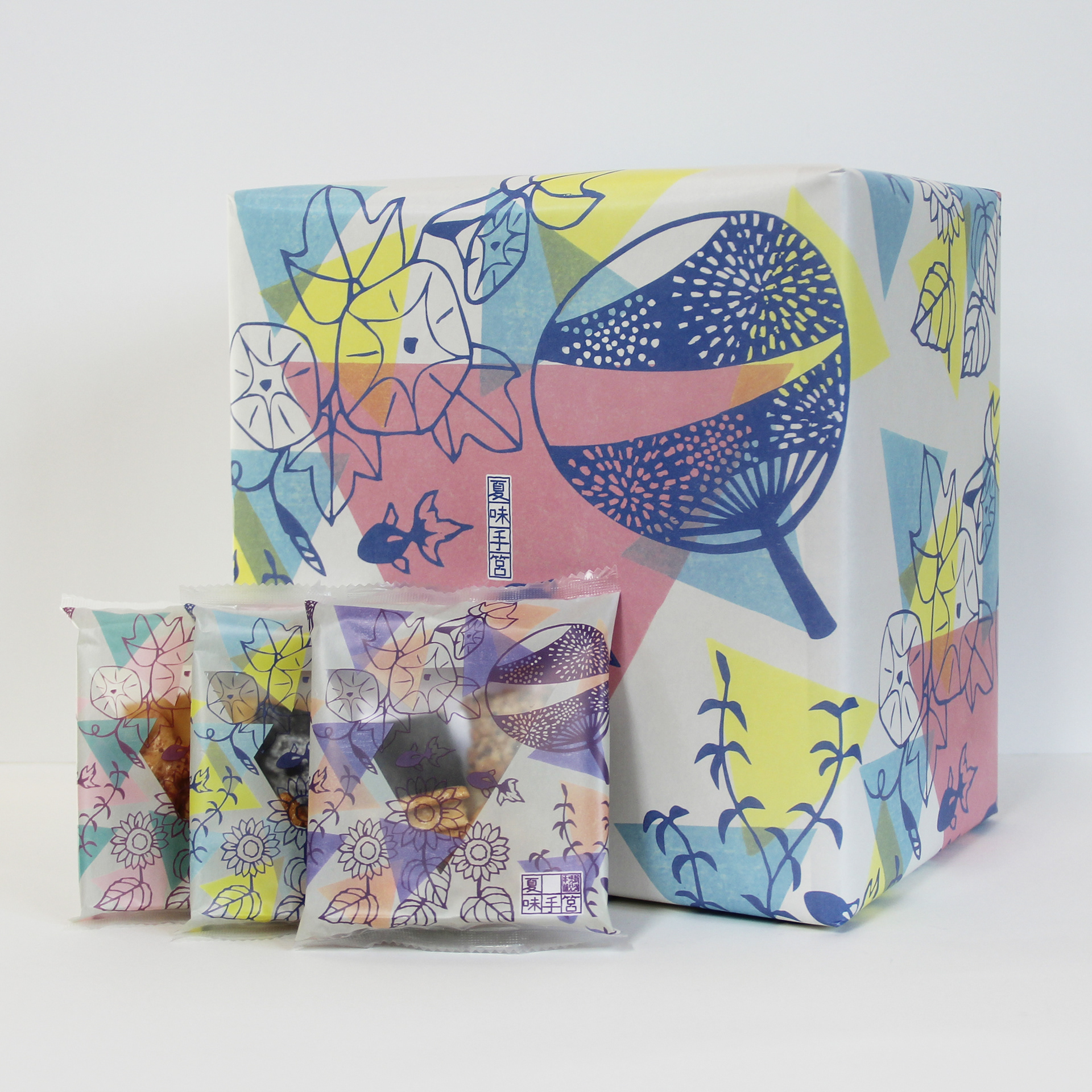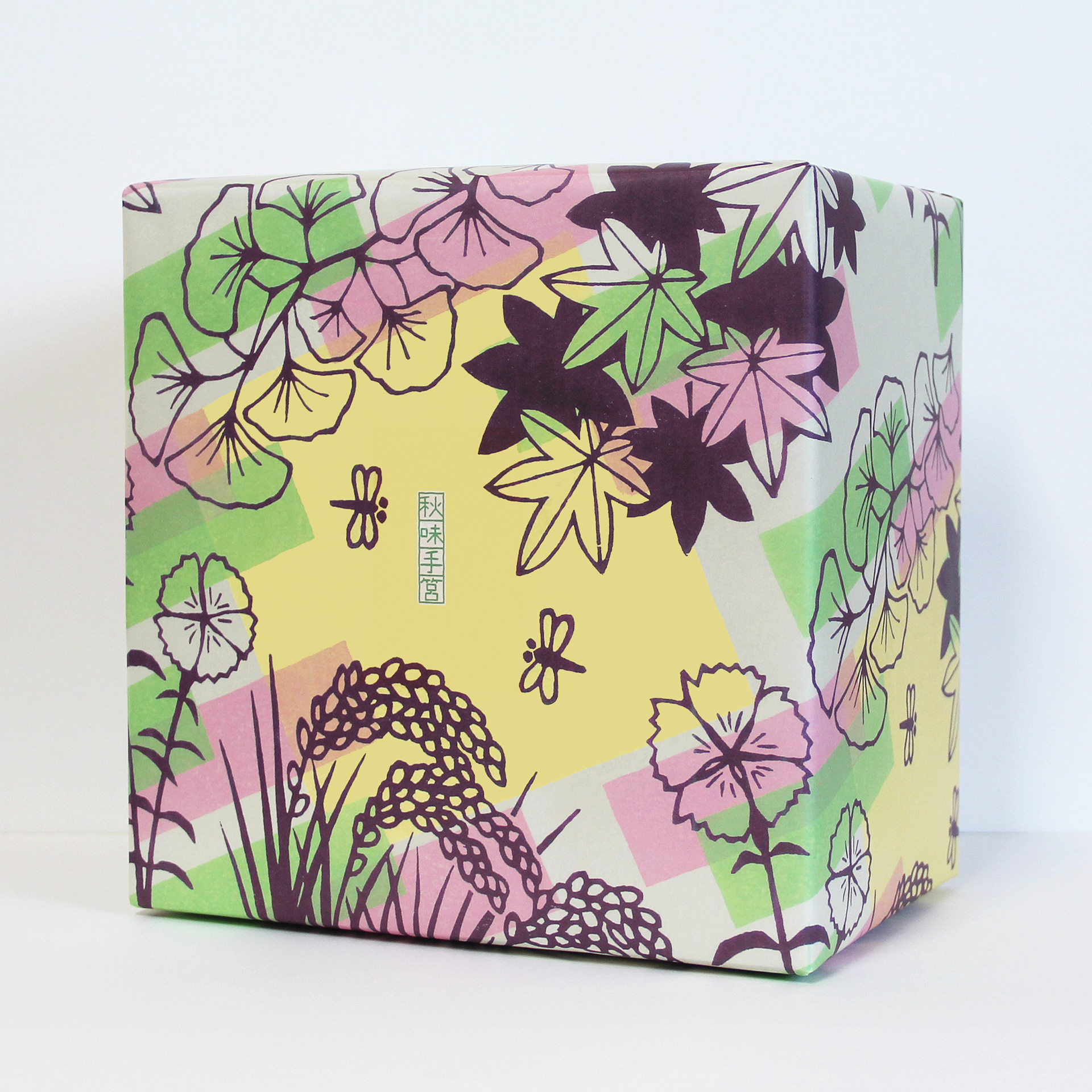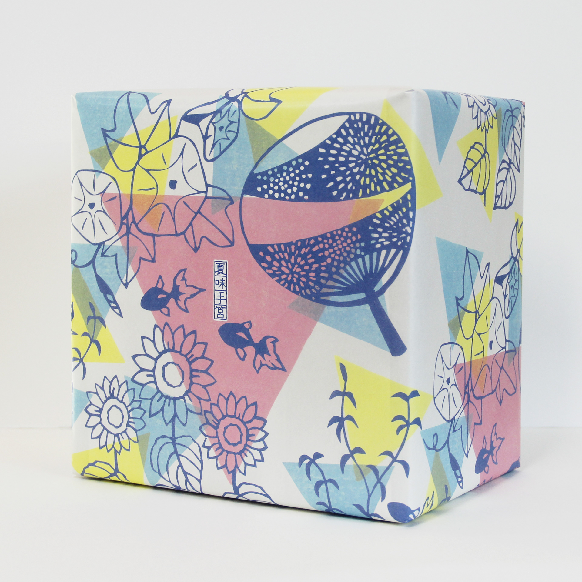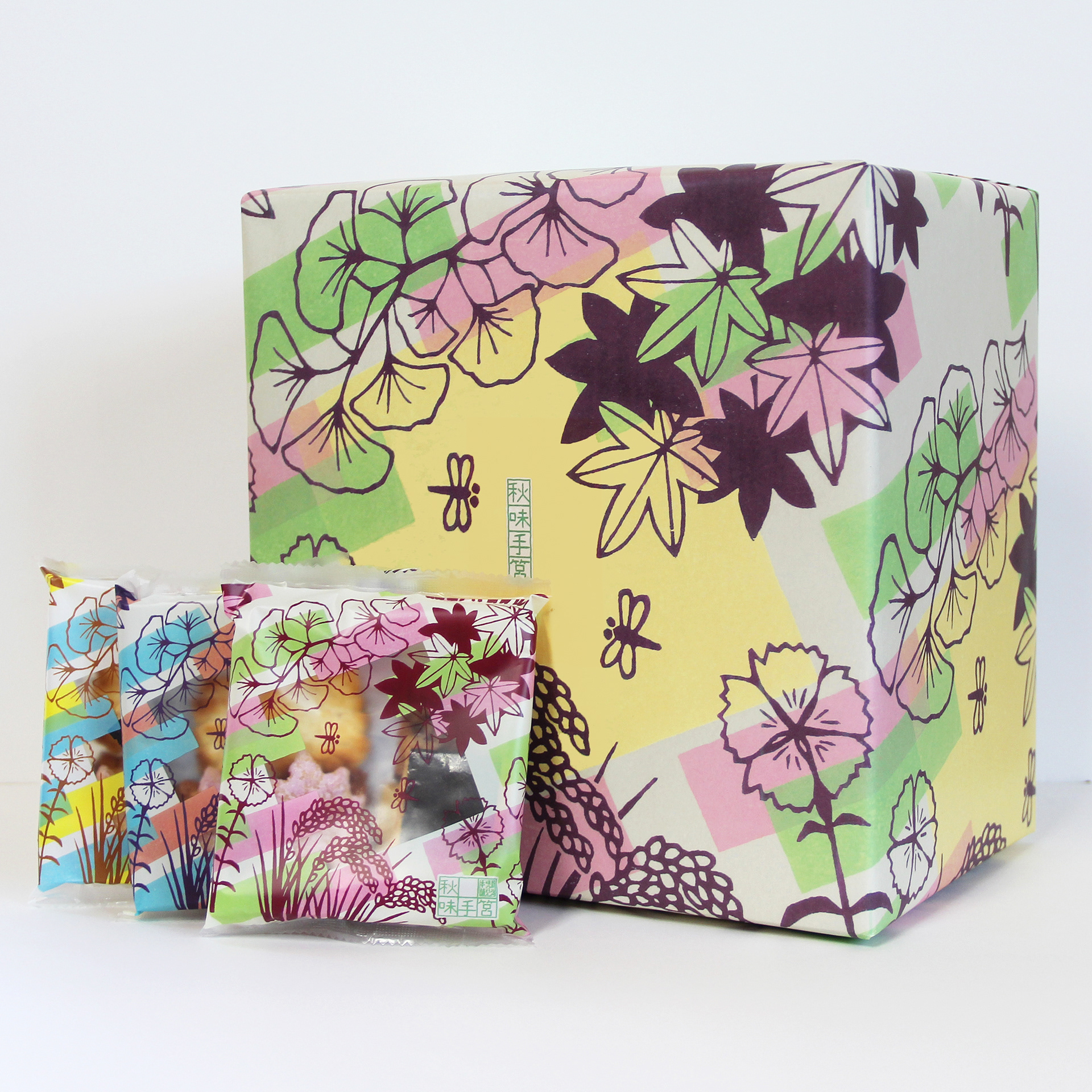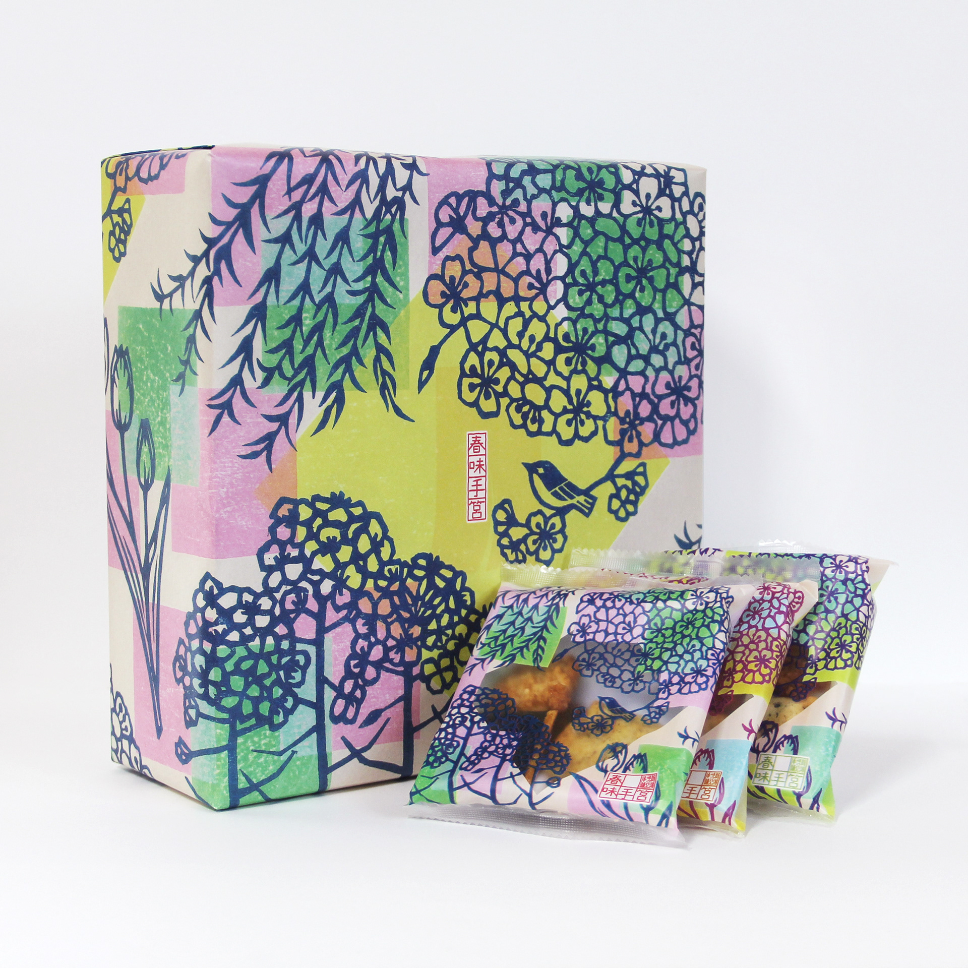 包装紙と小包装のイラストレーションを木版画で制作いたしました。春夏秋冬で絵柄が変わりました。