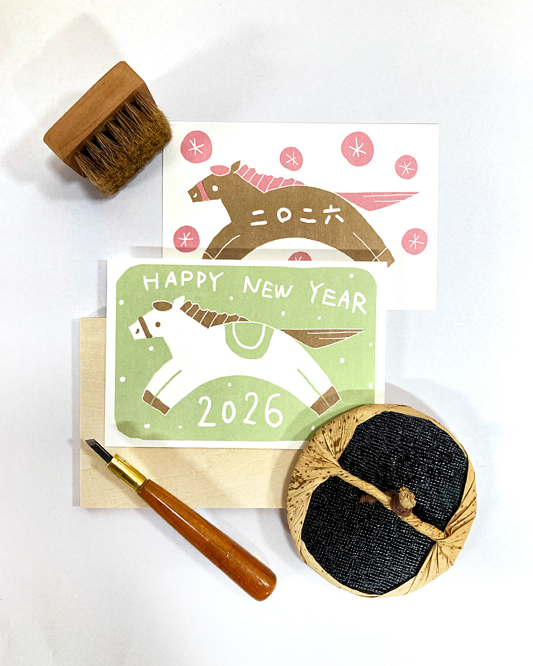 デザイン~彫り~摺りまで多色刷り木版画の一連の作業が体験できます。ベースとなるデザインにアレンジを加えてオリジナル作品を作ります。 ご挨拶状としても、お部屋に飾る作品としてもお楽しみいただけます。 初心者の方向けの講座です。どなたもお気軽にご参加ください。