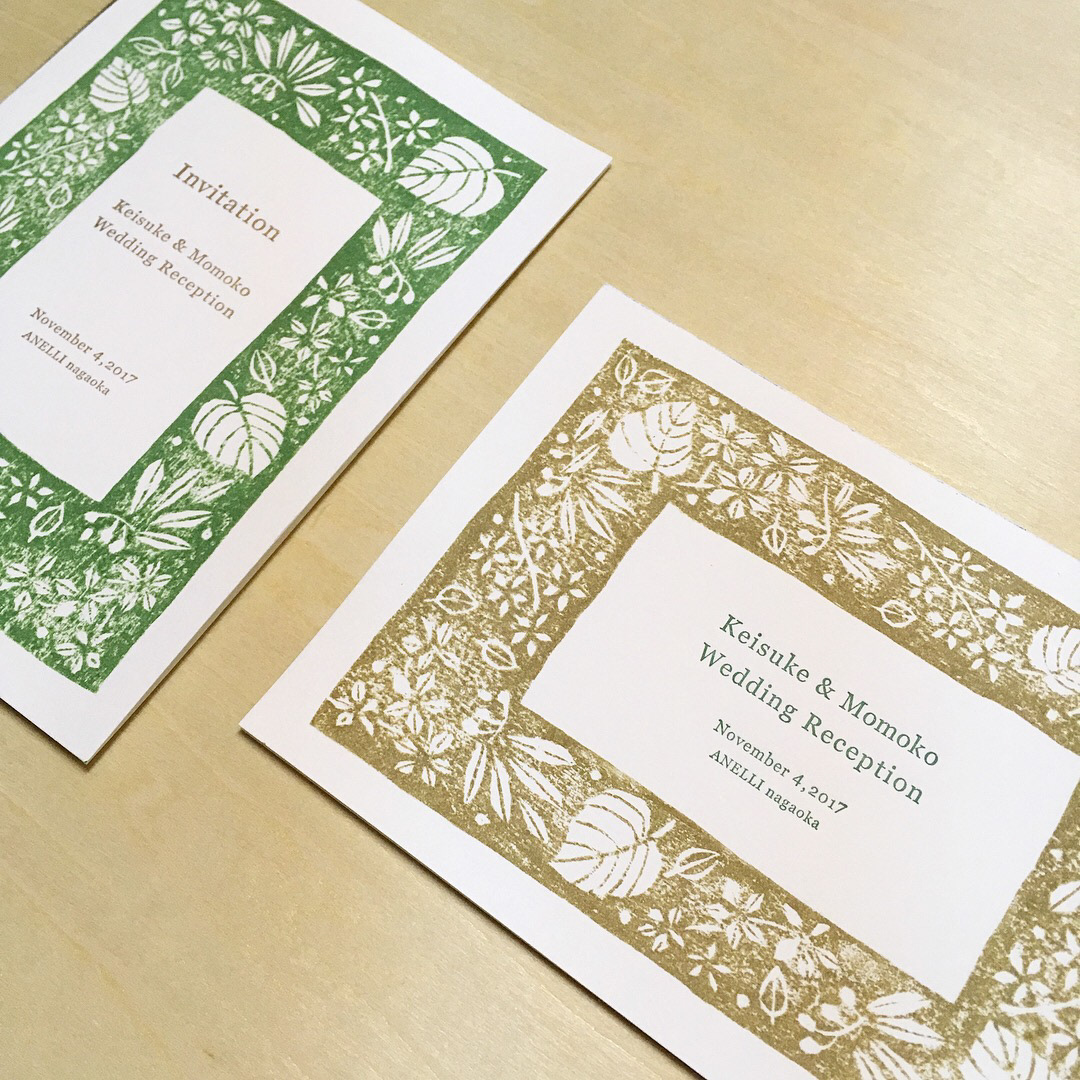 木版画は同じ版を使い、夏に送った招待状が、結婚式当日に秋になって葉の色が変わった、というコンセプトです。